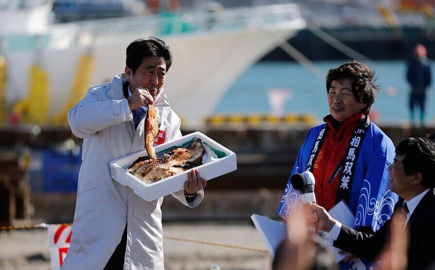 当地时间2014年12月2日,日本福岛索玛,日本众议院选举官方竞选活动启动,首相安倍晋三为自民党造势。日本众议院选举将在12月14日举行。为了讨好当地民众,安倍在活动现场品尝当地特色烤鱼,显示对农产品的支持。