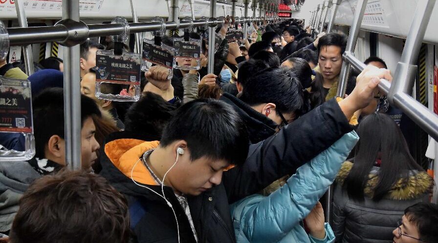1月4日,郑州地铁1号线的一个车厢内挤满了乘客。当日是2015年元旦假期后的首个工作日。在郑州市地铁1号线的各个站台上,很多市民等待乘车上班,售票点前排起了长队,车厢里更是人头攒动。人们“收拾”好放假的轻松心情,投入到新的一年忙碌的工作中。